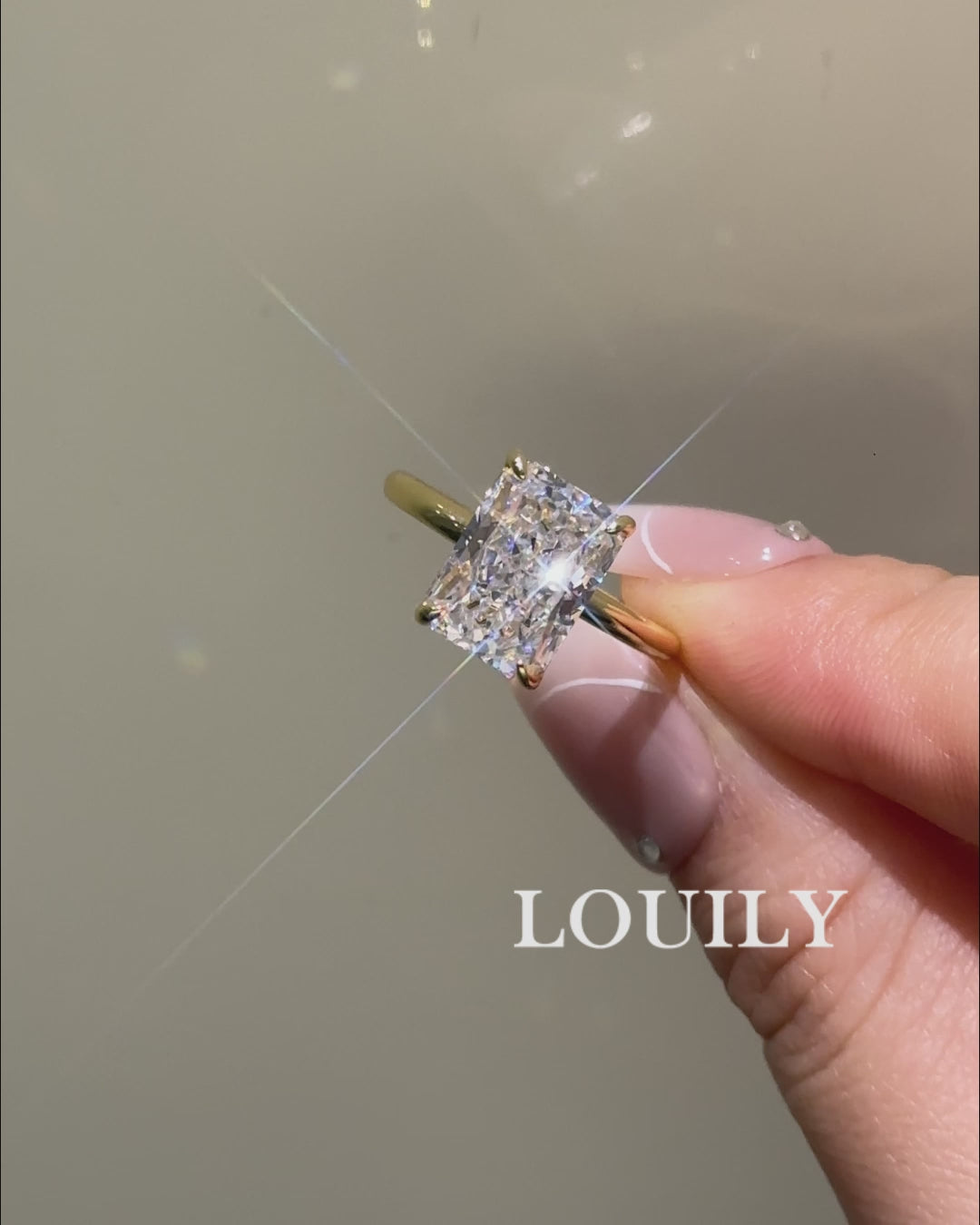 Combining the clean lines of an emerald-style silhouette with the intense brilliance of round cuts, the radiant-cut stone reflects light from every angle, creating a captivating presence that feels both bold and refined.