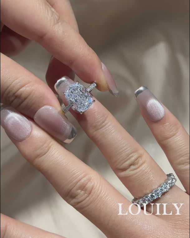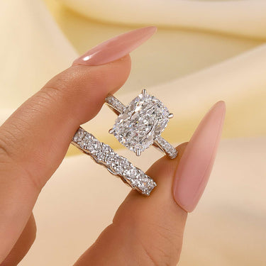 This set highlights a stunning 6.5Ct cushion cut engagement ring, paired with a round cut full wedding band that adds continuous sparkle all around. The cushion cut center stone delivers eye-catching brilliance, while the eternity band enhances it with a seamless circle of light.