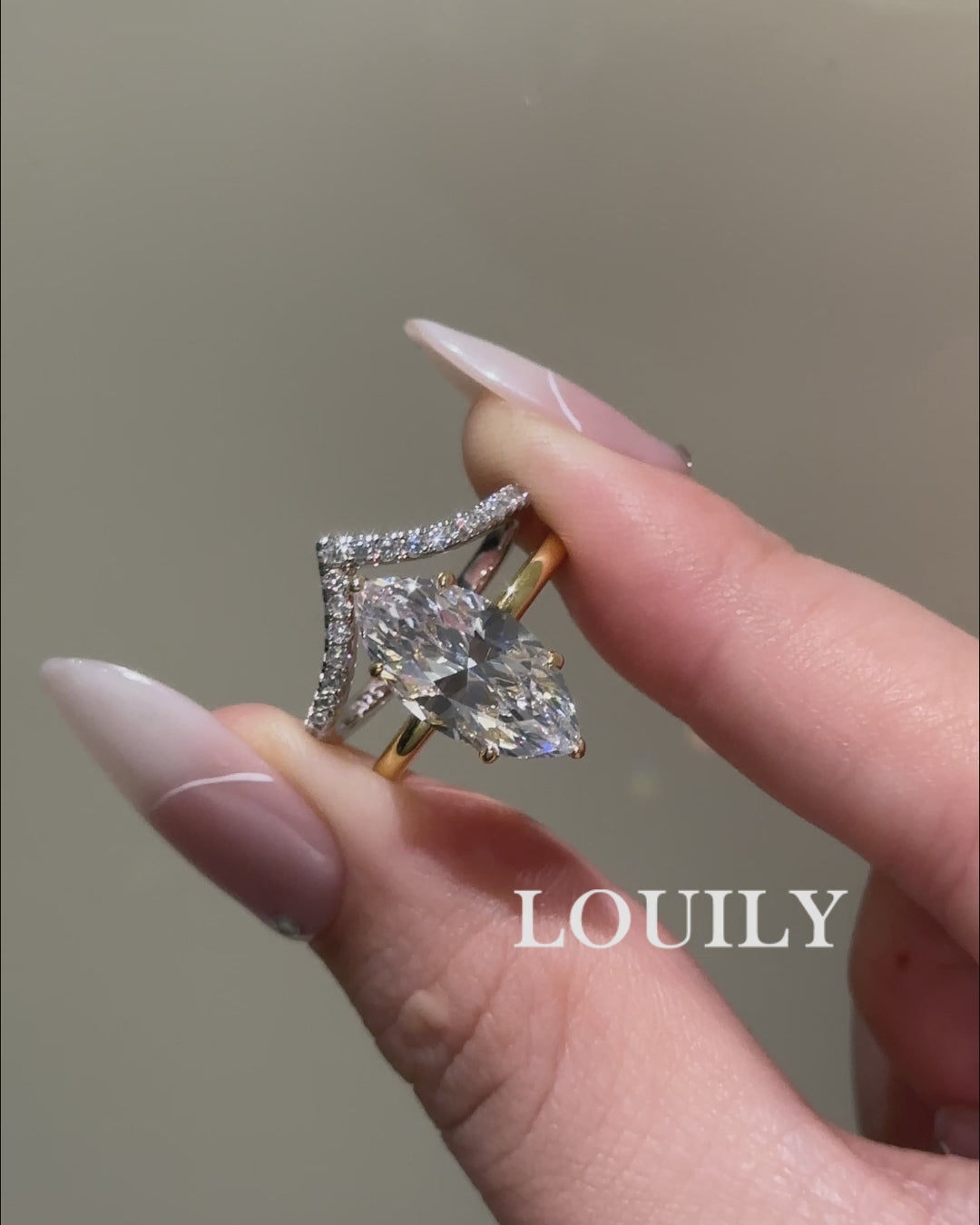 Design Inspiration:This ring set is inspired by the elegance of timeless sophistication and the harmony of modern romance. The marquise-shaped centerpiece reflects a sense of individuality and grace, while the hidden halo adds a subtle touch of brilliance, capturing light from every angle. The V-shaped band complements the central design, symbolizing unity and the seamless intertwining of two lives. Every curve and detail is crafted to evoke feelings of everlasting love and refined beauty.