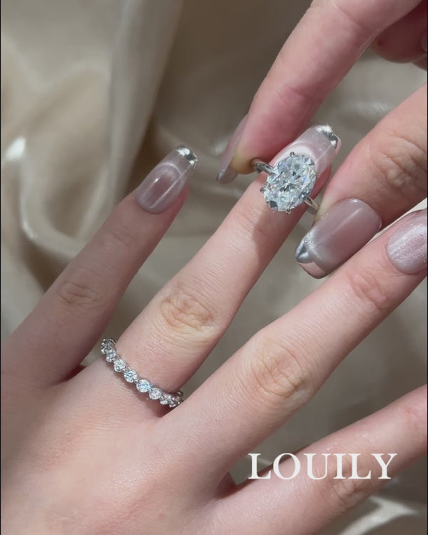 Design Inspiration:This exquisite ring set is inspired by the harmony of contrast and the beauty of lasting commitment. The oval-cut center stone in the engagement ring embodies grace and eternity, while the hidden halo beneath it adds a secret touch of brilliance—like a love that shines from within. Paired with a round-cut anniversary band, the two rings create a perfect balance between elegance and radiance. The warm white gold setting enhances the depth and warmth of the gemstones, symbolizing joy, devotion, and timeless celebration. Together, they tell a story of two souls intertwined—glowing brighter with every passing year.