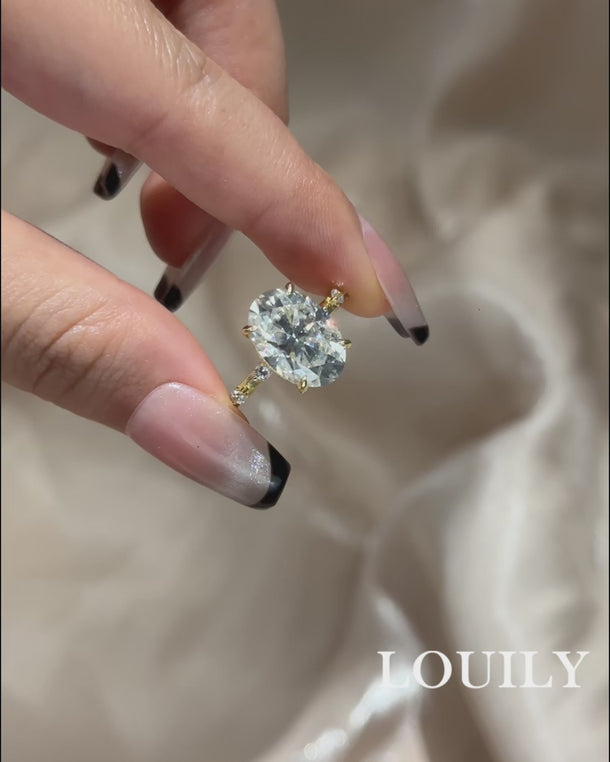 Design Inspiration: This engagement ring is a celebration of radiant beauty and timeless elegance, combining the luxurious allure of yellow gold with the brilliance of moissanite. The oval cut center stone is chosen for its graceful, elongated shape, which exudes sophistication while maximizing the stone's sparkle. Moissanite, with its extraordinary fire and brilliance, brings a modern twist to the classic engagement ring, representing a love that shines brighter with every passing day. The sterling silver band adds a touch of sleekness and durability, offering a refined contrast to the warm yellow gold setting. This ring is a perfect blend of tradition and innovation, designed for those who value both beauty and sustainability.