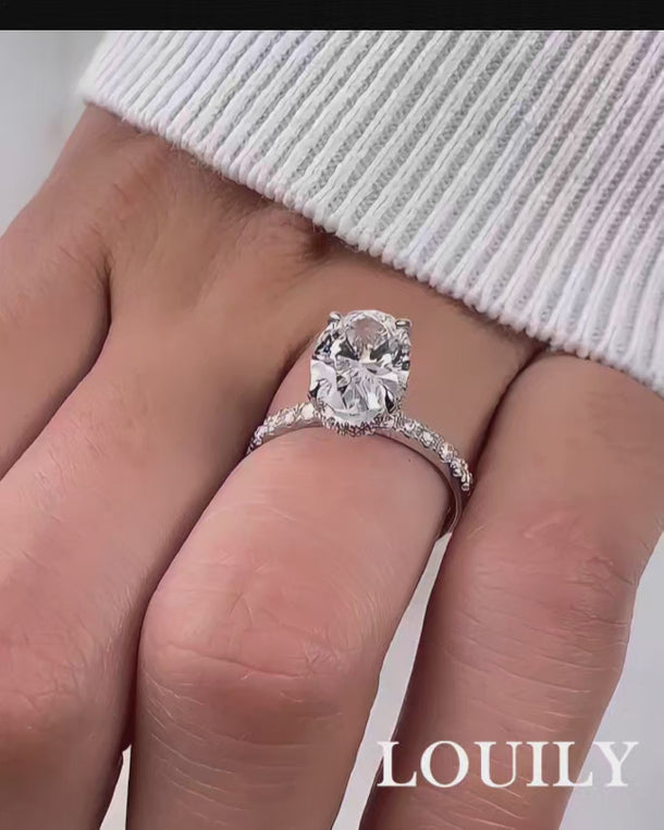 It is a breathtaking tribute to everlasting love. Featuring a stunning 4.0 carat oval cut center stone, this ring showcases a silhouette that’s both graceful and universally flattering. Its clean lines and elongated shape create a soft, romantic sparkle that catches the light with every movement.