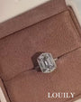 This ring features a striking 4.0 carat emerald cut center stone framed by a shimmering halo that enhances its clean, elongated silhouette. Handcrafted in sterling silver, it offers a perfect balance of vintage elegance and modern charm—ideal for travel or everyday wear.