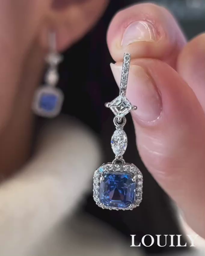 These sterling silver drop earrings feature stunning 2.0Ct Asscher cut blue stones that catch the light beautifully with every movement. The geometric facets of the Asscher cut give them a refined, vintage-inspired look, while the deep blue hue adds a luxurious pop of color.