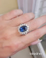 This stunning 4.0Ct engagement ring features a vivid oval cut blue stone at its center, encircled by a shimmering halo that enhances its brilliance. The elegant split shank design adds depth and modern detail while maintaining a classic silhouette. Crafted in sterling silver, this ring is a perfect combination of sophistication and personality—ideal for anyone who wants their love story to shine with color and distinction.