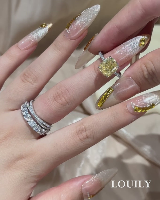 This 4.5Ct yellow stone cushion cut 3PC wedding ring set was inspired by the warmth of golden hour and the richness of vintage design. The bold cushion cut center stone shines with a vibrant, sunny hue that evokes joy and confidence, while its sterling silver setting provides a crisp contrast that enhances its brilliance. The additional bands—each carefully crafted—bring balance to the set, whether worn stacked or separately. Together, they form a regal yet wearable design that celebrates love with warmth, radiance, and individuality.