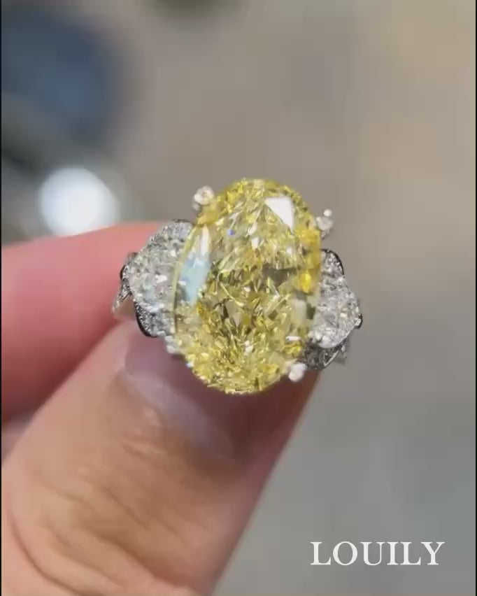 This ring was designed for the woman who isn’t afraid to shine, featuring a breathtaking 8.0 carat yellow oval cut center stone that radiates warmth and brilliance. Flanked by two shimmering side stones in a classic three-stone setting, it symbolizes your past, present, and future with stunning clarity. Crafted in sterling silver, this piece is perfect as a one-of-a-kind engagement ring or a luxurious statement ring that turns heads wherever it goes.