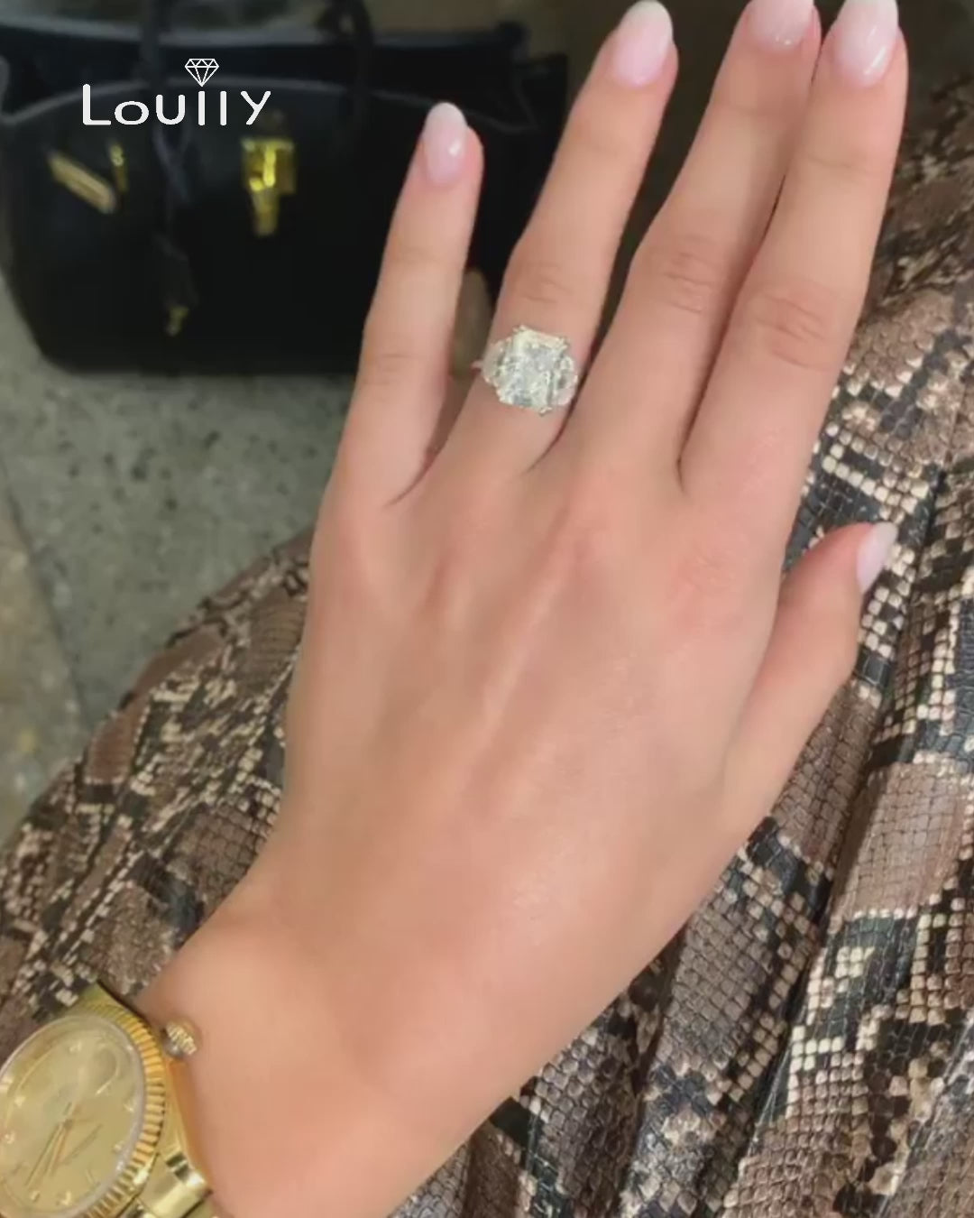 Introducing the Louily gorgeous radiant cut three stone engagement ring. Crafted with sterling silver for a luxurious feel, this timeless ring features a stunning radiant cut center stone and two side stones, perfect for expressing your unconditional love. The perfect way to make a statement.