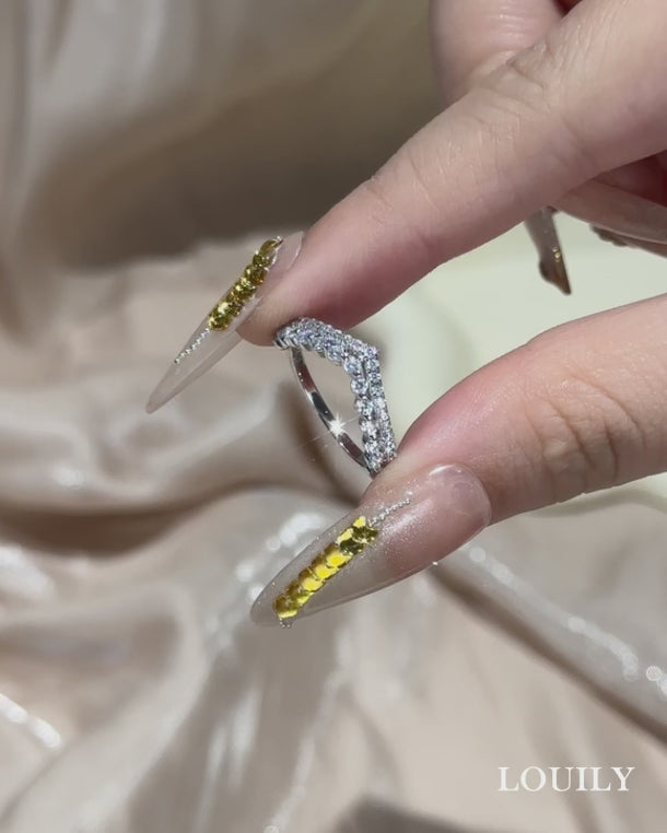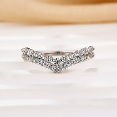 Crafted from hypoallergenic, tarnish-resistant sterling silver, the double row layout offers balanced brilliance and a modern edge. The gentle curve allows it to nest perfectly with solitaire, halo, or vintage-style rings, making it a versatile addition to your bridal set or a stunning standalone statement.