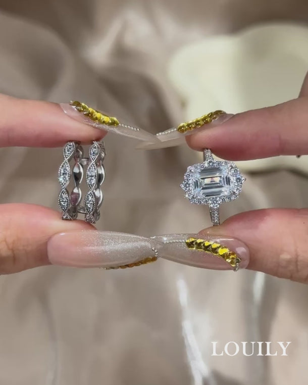 This set features a stunning 3.5 carat emerald cut halo engagement ring with a perfectly matched insert enhancer. The halo brings out the crisp brilliance of the emerald cut, while the enhancer slips around it seamlessly, adding depth, shine, and a distinctive layered look.