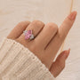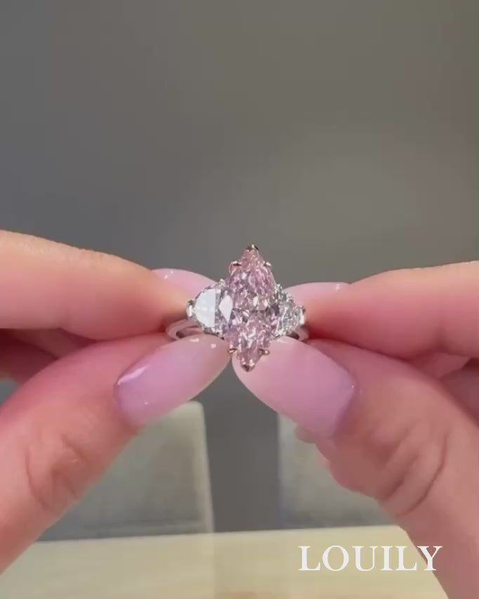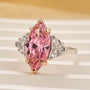 This three-stone engagement ring features a 4.0-carat pink marquise-cut center stone flanked by two smaller marquise-cut stones, all set in sterling silver. The soft pink hue adds a touch of romance, while the balanced three-stone design highlights the sparkle and sophistication of each gem. Perfect for someone who cherishes feminine elegance with a modern twist.