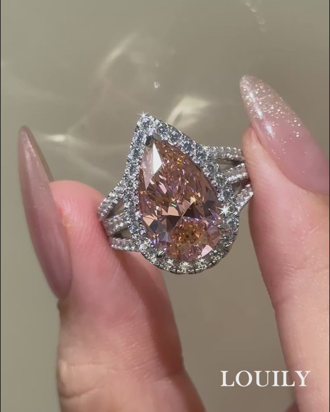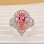 This engagement ring features a 4.5Ct pear cut pink stone set in a dazzling halo, perfectly balanced with a split shank design for added brilliance and charm. The vintage detailing and soft pink hue create a romantic and feminine look, while the sterling silver band provides a timeless finish.
