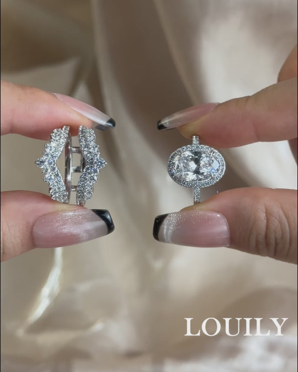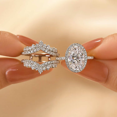 This three-piece ring set was designed for the woman who loves a touch of romance and refined elegance, featuring a dazzling 4.0 carat oval cut center stone framed in a shimmering halo. Paired with two V-shaped half eternity wedding bands, this sterling silver set creates a graceful, layered silhouette that enhances the sparkle and sophistication of each piece. A timeless choice for weddings, anniversaries, or meaningful everyday wear.