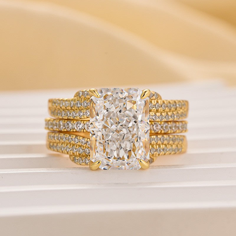 This 4.5Ct radiant cut insert wedding ring set features a striking center stone paired with a coordinating engagement ring enhancer. The radiant cut offers crisp, clean lines and brilliant sparkle, while the enhancer adds depth and dimension for a polished, layered look.