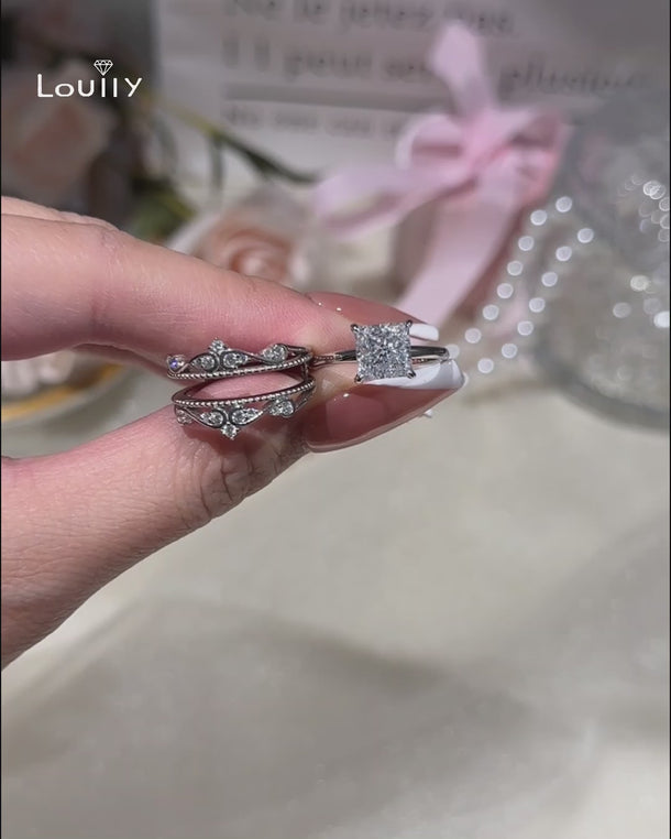 Louily Noble Crown Design Square Princess Cut Insert Wedding Ring Set