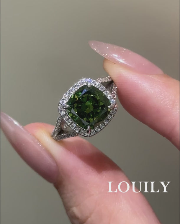 Louily Vintage Green Stone Split Shank Cushion Cut Engagement Ring