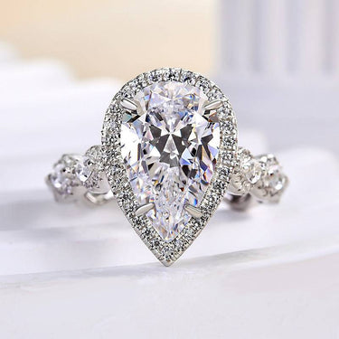 This exquisite engagement ring is designed to dazzle. Crafted in elegant gold with a halo of sparkling stones surrounding the pear-cut center, this ring will draw attention wherever you go. Its timeless classic shape adds a touch of luxury, making it the perfect symbol of love and commitment.