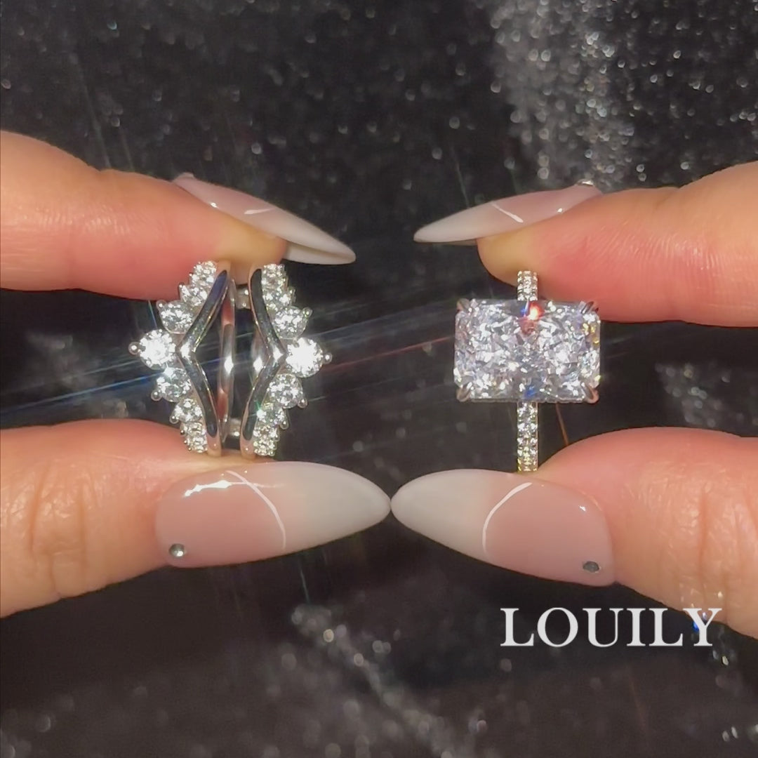 This wedding ring set features a breathtaking 7.0 carat radiant cut centerpiece framed by a crown-shaped enhancer that adds an air of elegance and distinction. The radiant cut stone reflects light beautifully from every angle, while the enhancer creates a regal silhouette that feels both graceful and powerful.