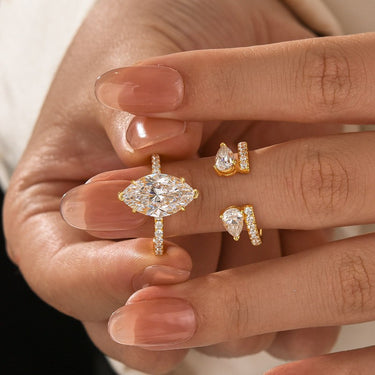 This design features a 4.0 carat marquise-cut moissanite set in warm yellow gold, complemented by an open pear-cut enhancer ring that creates a layered, luminous effect. The pairing blends timeless elegance with a modern twist, making it ideal for someone who wants a wedding ring that feels both unique and effortlessly sophisticated.