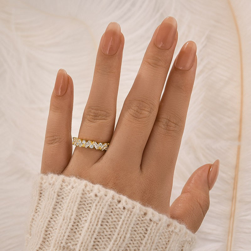 This 1.8 carat half round cut and emerald cut wedding band in sterling silver combines two elegant shapes for a unique, eye-catching look. The half round cut stones create a smooth, continuous shimmer, while the emerald cuts add crisp lines and refined sparkle. Perfect for wearing solo or paired with an engagement ring to create a beautifully balanced stack.