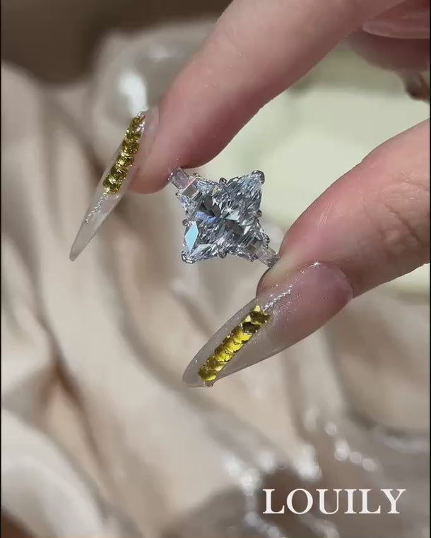 The 4.0Ct Marquise Cut Three Stone Engagement Ring in Sterling Silver is a graceful expression of past, present, and future love. At its center shines a captivating marquise cut stone—elongated and luminous, with a shape that flatters the hand and draws in the light.