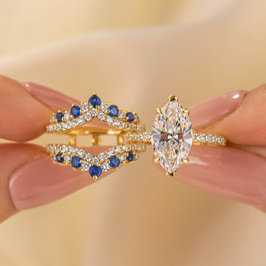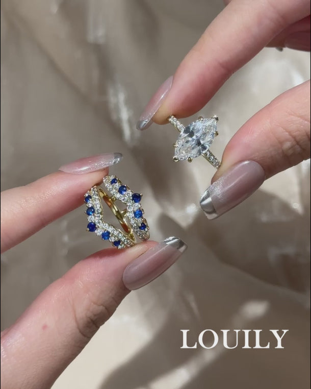Design Inspiration:Inspired by the celestial dance of twin stars in the midnight sky, this set weaves together cosmic destiny and eternal devotion. The marquise cut center stone stretches like a gleaming starlight, embraced by a half eternity band that mirrors its radiant flow. The enhancer wedding band, adorned with blue and white stones, wraps the design like a delicate constellation—symbolizing how two souls, though unique in essence, orbit one another in harmonious, timeless unity.