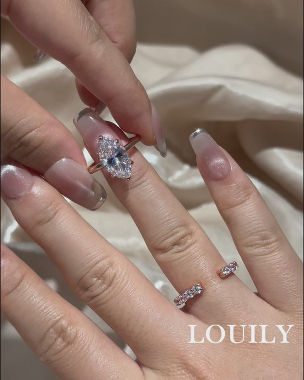 This pairing features a dazzling 4.0 carat marquise cut engagement ring complemented by a classic open wedding band. The elongated marquise stone delivers graceful sparkle, while the open band adds a touch of contemporary charm, balancing tradition with modern design.