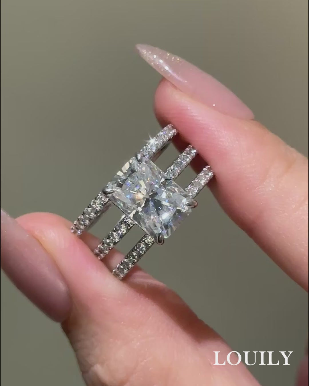 It is a luminous blend of elegance and strength. At its heart lies a 3.5 carat radiant cut moissanite, prized for its intense sparkle and sharp, modern lines. Flanked by two coordinating bands—one with timeless round stones and the other with delicate pavé accents—this trio creates a seamless, layered look full of dimension and brilliance.