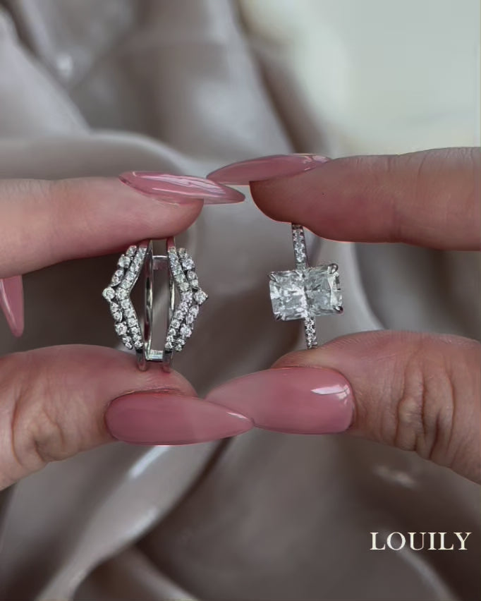 The Moissanite 3.5CT Radiant Cut Insert Wedding Ring Set With Jacket Stack Wedding Band is the perfect blend of opulence and sophistication. Featuring a brilliant 3.5-carat radiant-cut moissanite center stone, the engagement ring sparkles with an incredible fire and radiance that will captivate from every angle. Paired with a delicate, stackable band jacket, this set offers an elevated look with intricate detailing, ensuring a sense of timeless elegance and modern allure.