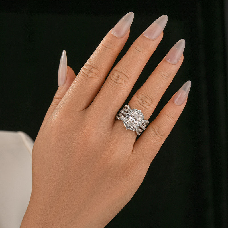 Design Inspiration:This 3.0Ct Moissanite stackable wedding ring set features a radiant cut center stone paired with an enhancer band, all crafted in white gold. The clean geometric lines of the radiant cut are complemented by the elegant enhancer, creating a layered look that is both contemporary and timeless. Ideal for those who love versatile rings that can be worn together or separately for a personalized, luxurious style.