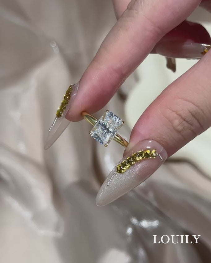 This ring was designed for the woman who loves timeless glamour with a contemporary edge, featuring a breathtaking 3.5 carat radiant cut moissanite that captures and reflects light with incredible fire. Set in sterling silver, its clean lines and bold presence make it perfect as an unforgettable engagement ring or a dazzling addition to your collection. It’s a piece that celebrates love with brilliance and sophistication.