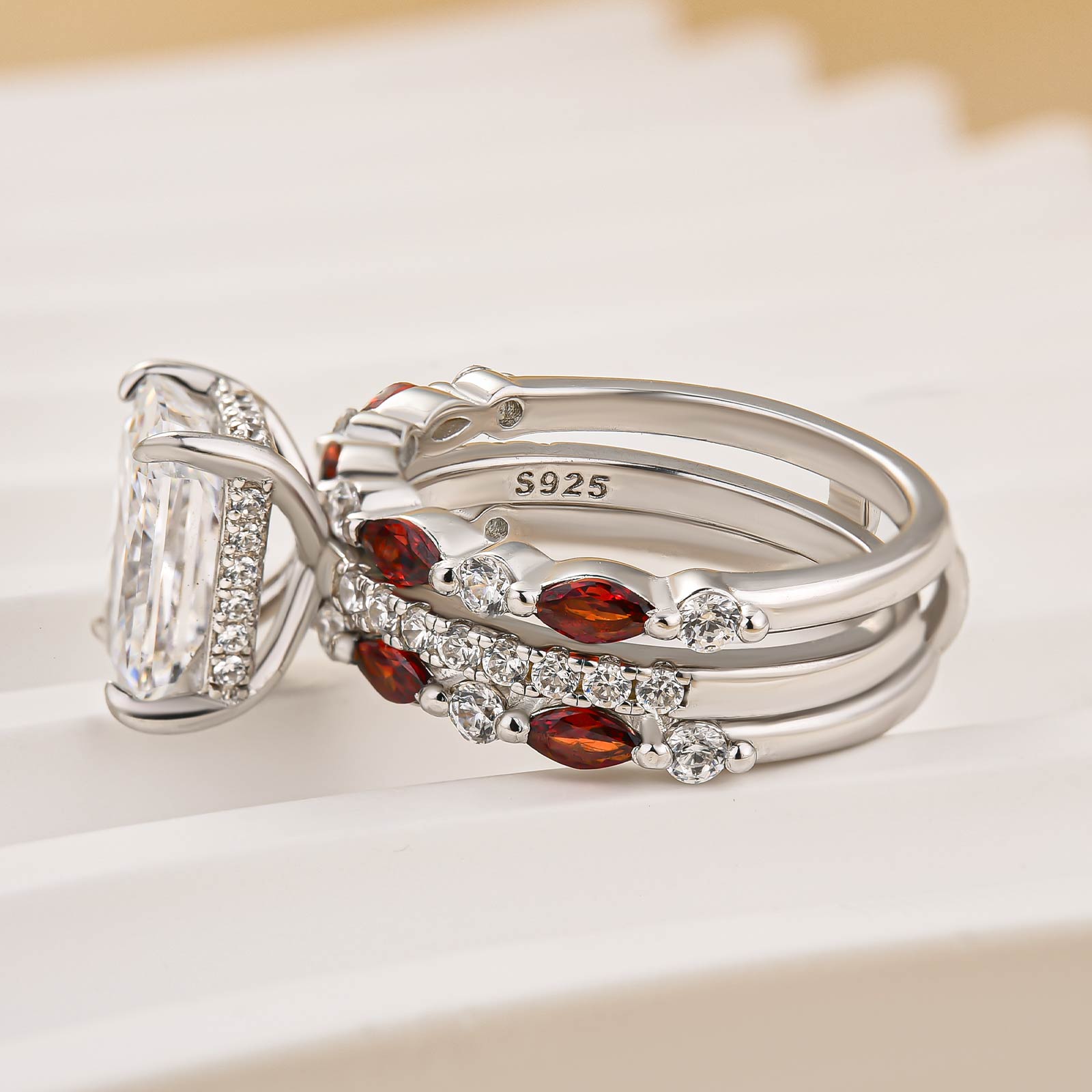 This wedding ring set showcases a dazzling 3.5Ct radiant cut centerpiece, paired with a unique enhancer that features both blue and white stones for a stunning contrast. The insert design allows the pieces to fit together seamlessly, creating a look that feels both refined and distinctive.