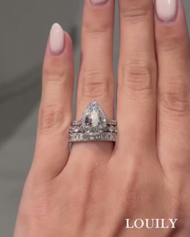 This 3PC 2.2Ct pear cut halo wedding ring set features a dazzling pear-shaped halo engagement ring, paired with two distinct wedding bands—one adorned with brilliant round cuts for classic sparkle, and the other with sleek emerald cuts for refined sophistication. The combination offers both versatility and elegance, perfect for creating a layered look that feels unique and timeless.