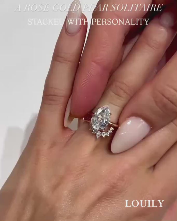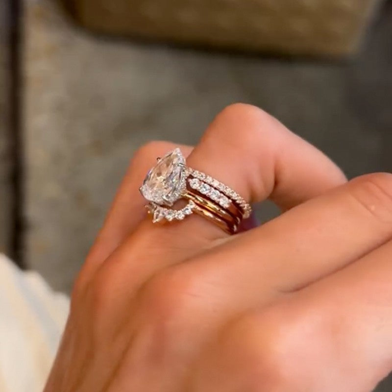 This 4PC set features a stunning 4.0Ct pear cut engagement ring paired with three beautifully designed vintage-style wedding bands. The pear cut stone creates a graceful focal point, while the sterling silver finish and intricate details give the entire set a refined, antique-inspired charm.