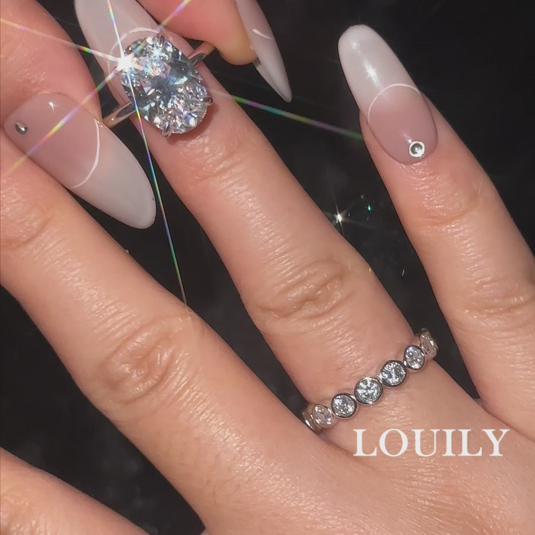 The round-cut full eternity wedding band represents infinity and unwavering commitment, with each perfectly matched stone reflecting cherished moments throughout a lifetime. Together, the oval engagement ring and the eternity band form a harmonious balance between classic romance and modern luxury, celebrating a love that shines endlessly and grows stronger with every passing day.