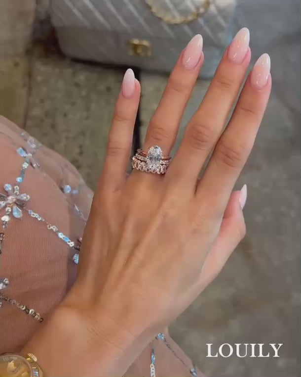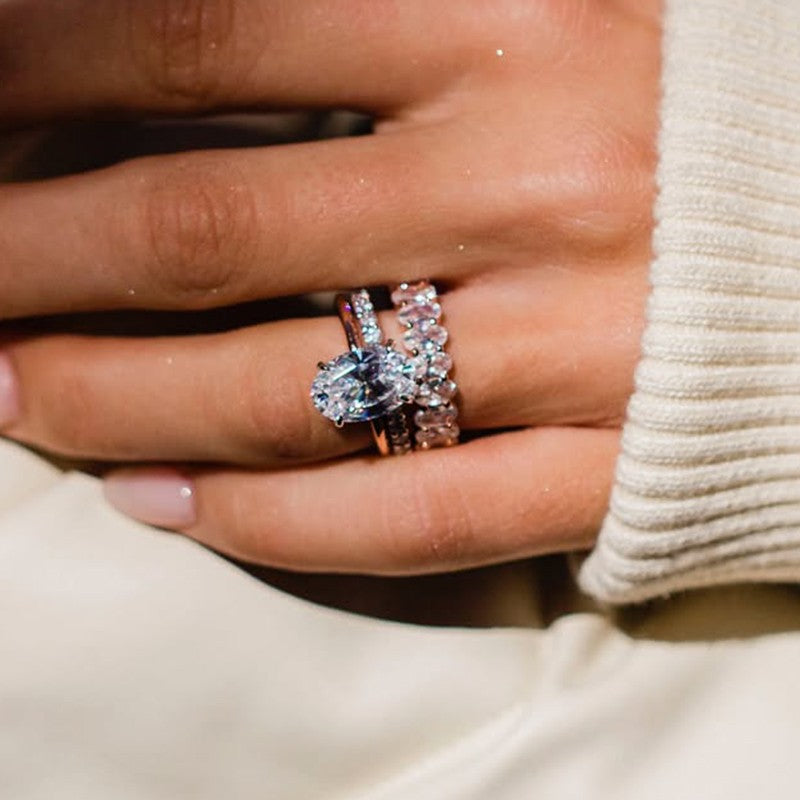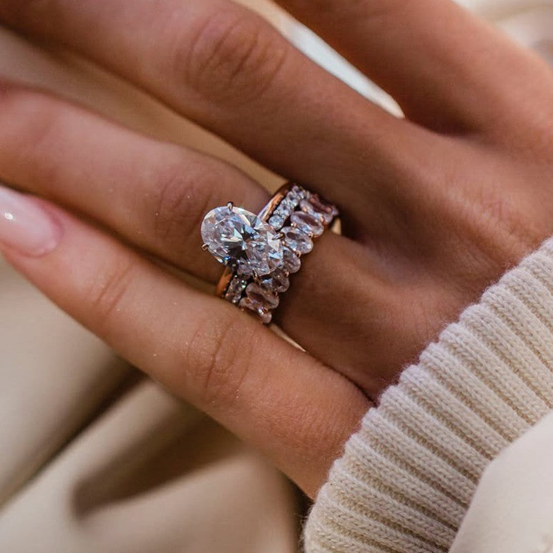 This three-piece set includes a matching oval cut band that mirrors the brilliance of the center stone, and a sleek open wedding band that adds a modern twist. The combination offers endless styling possibilities—stack them all together for a bold, layered look or mix and match depending on your mood or occasion.