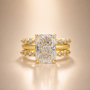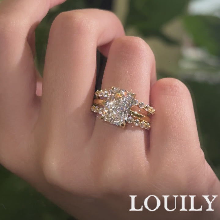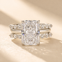 Crafted for the modern bride, this set features a 4.5ct radiant-cut solitaire engagement ring, its brilliant facets delivering unmatched sparkle. The enhancer wedding band, with its dual-row pavé design, wraps seamlessly around the center stone, elevating the ring’s brilliance. Made in S925 sterling silver, it blends timeless elegance with contemporary luxury, creating a luminous, stackable look perfect for everyday wear and lifelong commitment.