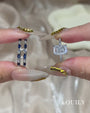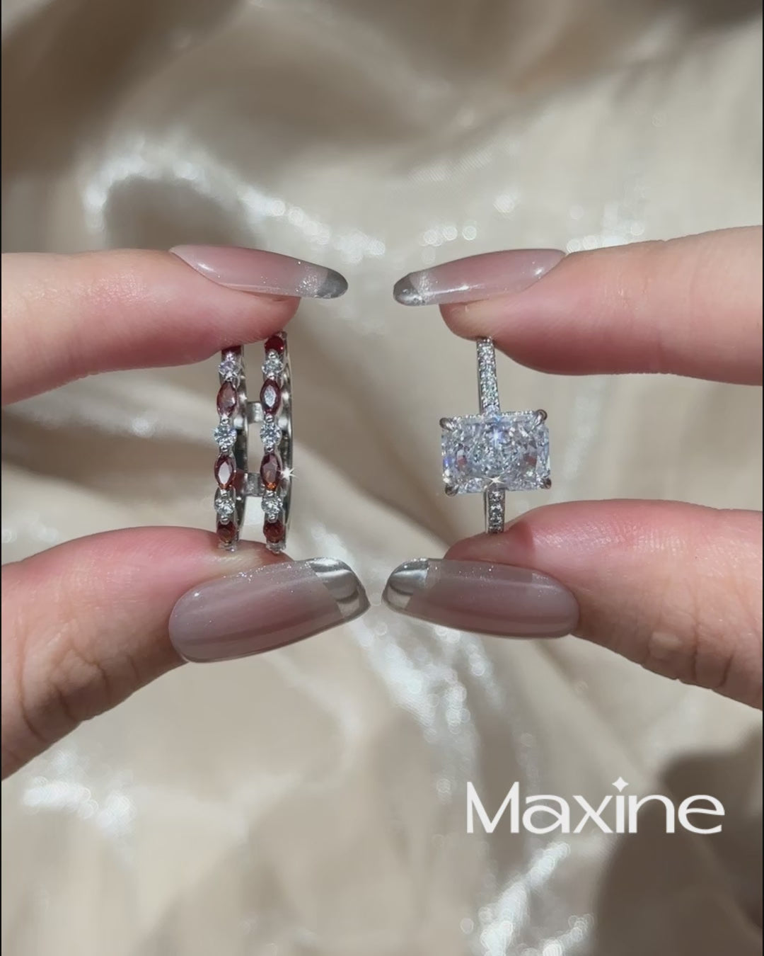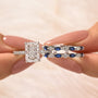 This wedding ring set showcases a dazzling 3.5Ct radiant cut centerpiece, paired with a unique enhancer that features both blue and white stones for a stunning contrast. The insert design allows the pieces to fit together seamlessly, creating a look that feels both refined and distinctive.