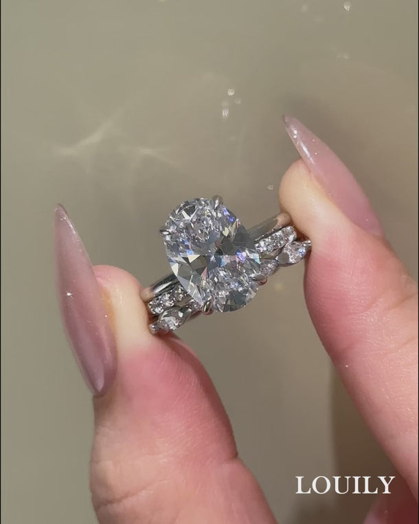 This ring set was created for the woman who treasures classic elegance with a hint of modern flair, featuring a radiant 4.5 carat oval cut center stone that exudes captivating brilliance. The set includes one marquise cut wedding band and one open wedding band, each thoughtfully crafted to add unique texture and charm. Perfect as a promise ring or a chic wedding set, it offers endless styling possibilities—wear them all together for a bold statement or mix and match for a look that’s uniquely yours.