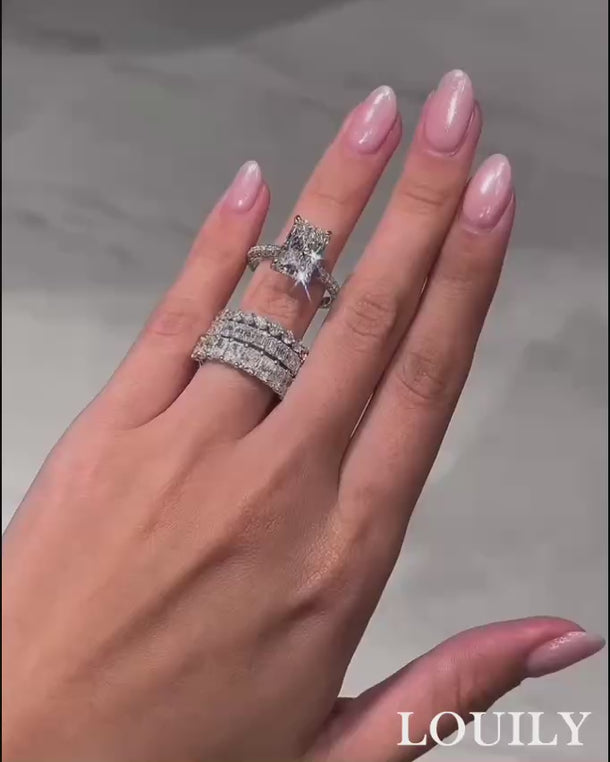 This four-piece ring set was designed for the woman who seeks both glamour and timeless style, featuring a brilliant 5.0 carat radiant cut center stone surrounded by a curated mix of luxe wedding bands. Crafted in sterling silver, each piece adds its own unique shimmer, creating a layered look that’s both cohesive and striking. Perfect for marking life’s most cherished moments with sophistication and sparkle.