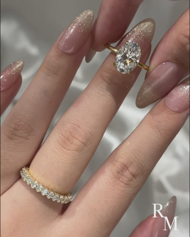 This Moissanite 4.0Ct oval cut yellow gold engagement ring is paired with an oval cut eternity ring, creating a striking duo of brilliance. The elongated oval center stone delivers timeless elegance, while the eternity band adds a seamless, shimmering flow around the finger.