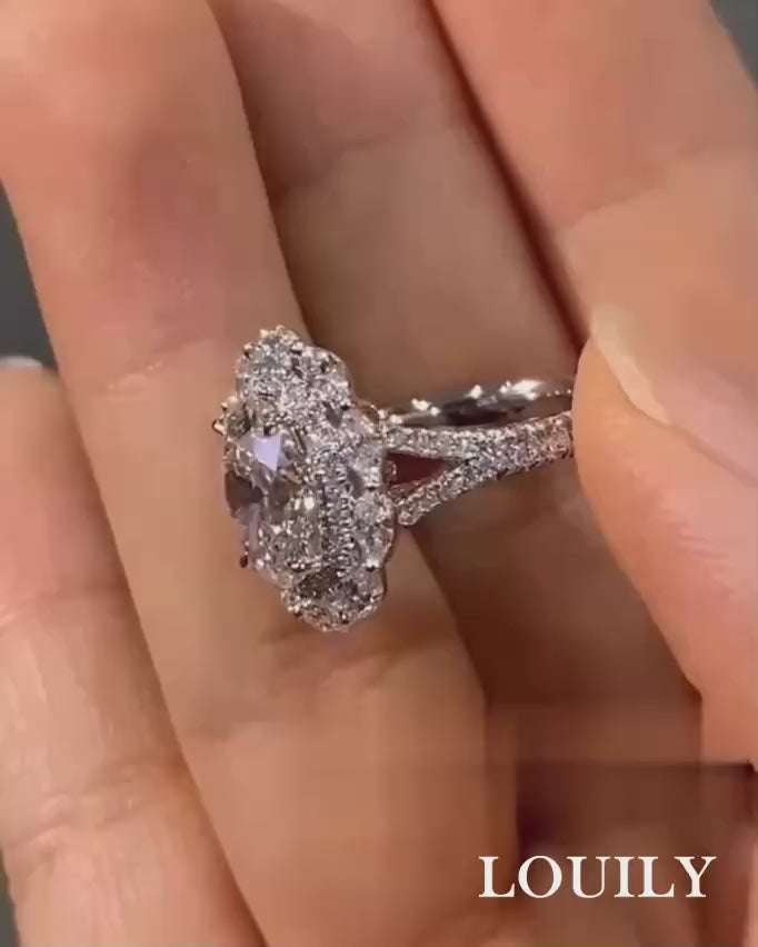 This ring was crafted for the woman who adores classic beauty with a luminous twist, featuring a dazzling 3.0 carat oval cut center stone surrounded by a sparkling halo that enhances its brilliance. Set in sterling silver, the elegant design offers a refined yet eye-catching presence—perfect as a meaningful engagement ring or a glamorous travel companion. It’s a beautiful reminder of love, wherever life takes you.