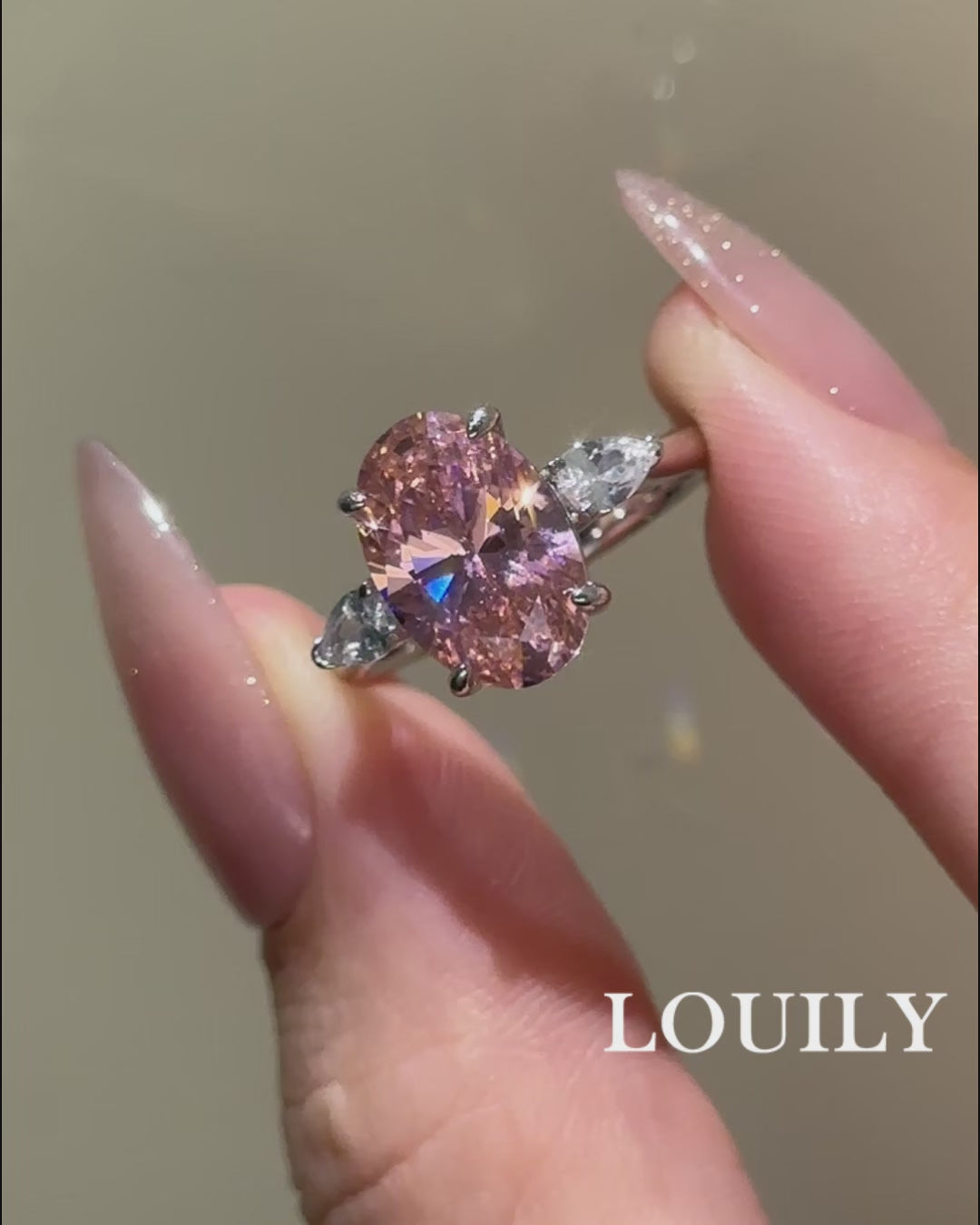 A celebration of romance in its rarest hue, this engagement ring is crowned with a vivid pink oval cut diamond—a symbol of love as unique as your story. The elongated oval shape radiates feminine grace, while its delicate blush tone evokes passion, tenderness, and timeless beauty. On either side, brilliant side stones are set with precision, creating a harmonious balance that magnifies the allure of the center gem. More than a ring, it is a design to embody everlasting devotion and the poetry of true love.