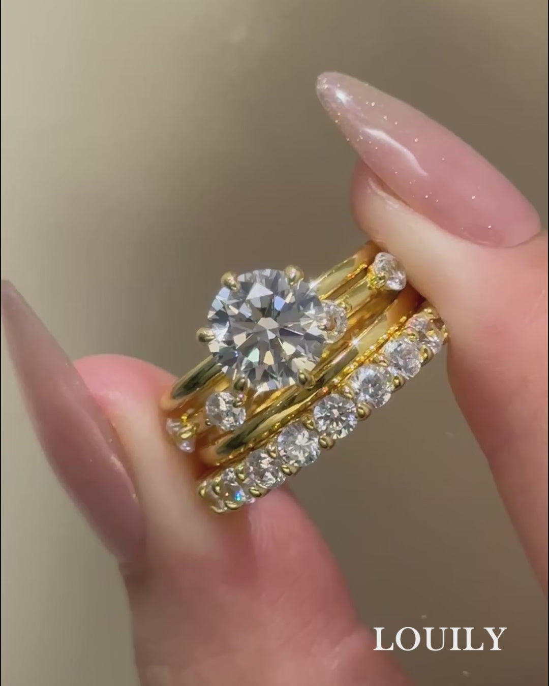 This 4-piece set showcases a 2.0Ct round-cut centerpiece paired with three beautifully coordinated bands in sterling silver. Designed for endless mix-and-match possibilities, it blends timeless elegance with everyday wearability, letting you create a look that feels uniquely yours.