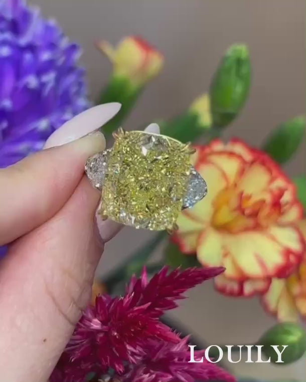 Louily Romantic Yellow Stone Cushion Cut Three Stone Engagement Ring