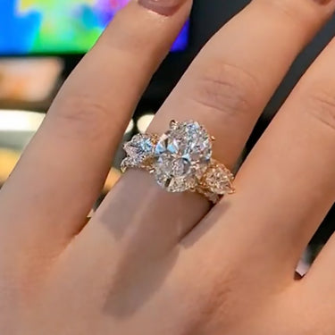 This 3PC set features a dazzling 4.5Ct oval cut engagement ring, complemented by a timeless classic wedding band and a perfectly matched engagement ring enhancer. The enhancer frames the center stone to amplify its brilliance, while the band offers a refined touch for everyday wear.