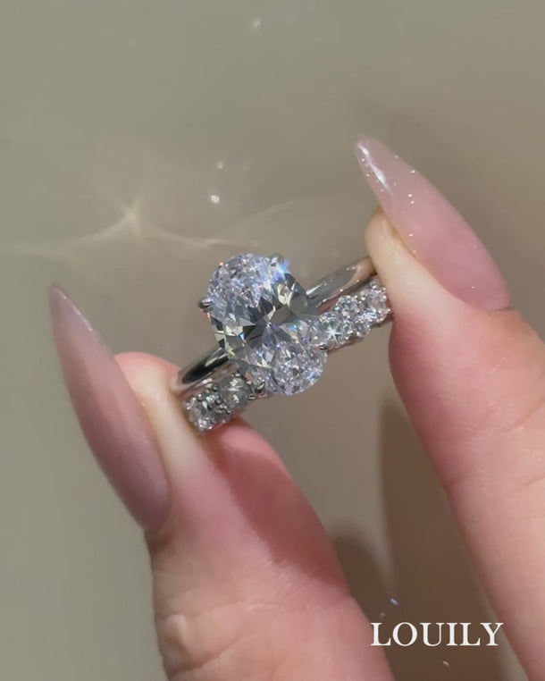 This 4.0Ct oval cut engagement ring shines with elongated brilliance, perfectly complemented by a round cut wedding band that adds classic sparkle and balance. The combination creates a harmonious look that feels both modern and enduring.