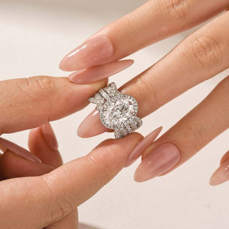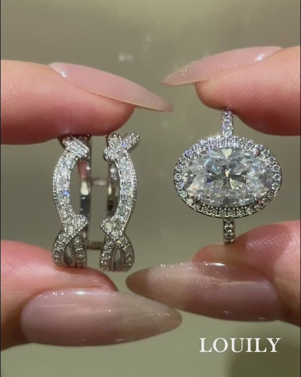 This 4.0Ct Moissanite stackable set features a stunning oval cut center stone surrounded by a delicate halo, paired with a coordinating enhancer band in white gold. The halo adds extra brilliance while the enhancer creates a seamless, layered look that feels both luxurious and versatile.