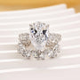 At its center shines a 5.0-carat pear-cut simulated diamond, combining the brilliance of a round cut with the elegance of a teardrop shape. The 3-prong setting highlights the stone’s natural silhouette while allowing light to flow freely for exceptional sparkle.
