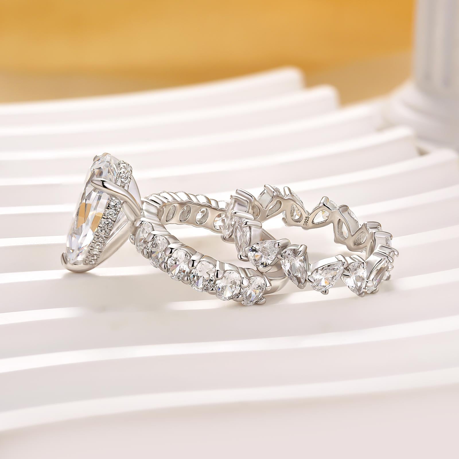 S925 2PC 5.0Ct Side Stone Pear Cut Engagement Ring with Pear Cut Wedding Band
